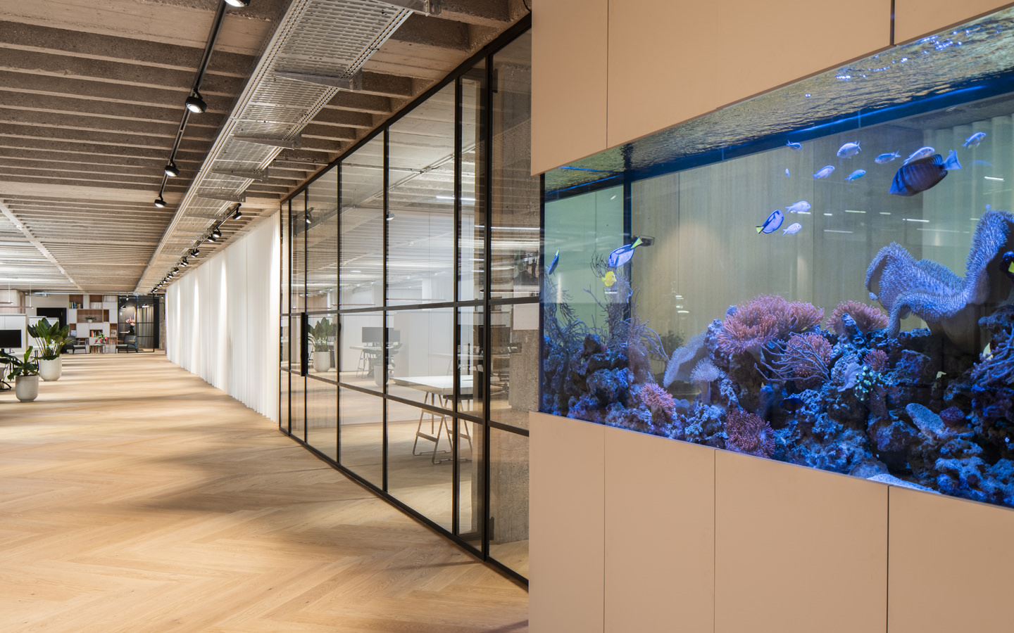 در سبک دکوراسیون مدرن، برای تقویت روحیه و افزایش انرژی مثبت در کارمندان، بهرهگیری از گیاهان طبیعی در محیط های اداری پیشنهاد میشود. گیاهان سبز با بهبود کیفیت هوا، در بهبود حالت روحی کارمندان نقش قابل توجهی را ایفا میکنند. همچنین، استفاده از آکواریم که عناصر طبیعی و تزئینی دارد به همان میزان سبب ایجاد فضای آرام بخش شده و زیبایی دکوراسیون اداری مدرن را افزایش میدهد.